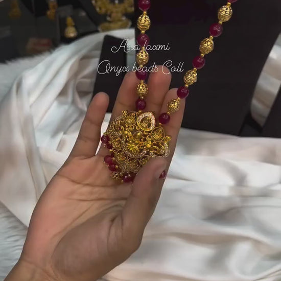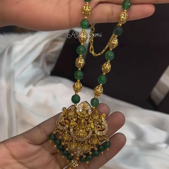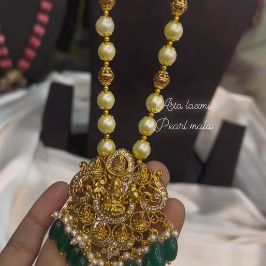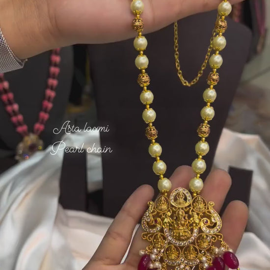 Embrace divine blessings with this exquisite Ashtalaxmi locket beads chain set, a sacred symbol of prosperity and abundance. Crafted with meticulous attention to detail, this elegant ensemble features the eight forms of Lakshmi, each representing different aspects of wealth and well-being. The lustrous beads complement the intricately designed locket, creating a harmonious blend of spiritual significance and timeless beauty. Perfect for daily wear or special occasions, this set serves as a meaningful reminder of your connection to prosperity and grace. Ideal for those seeking to infuse their life with positive energy and cultural richness.