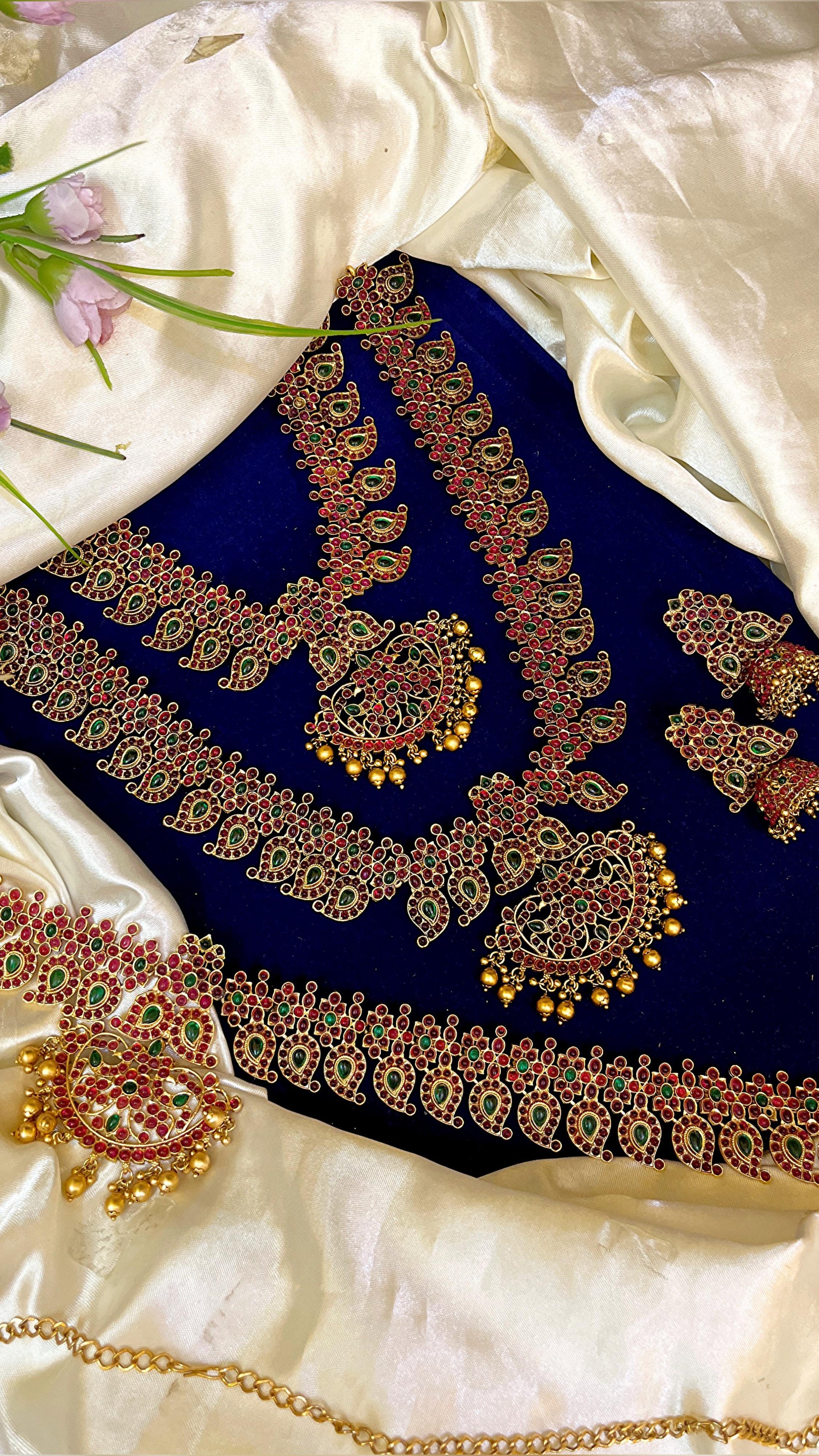 Elevate your bridal look with this stunning kemp set, a timeless collection designed to complete your wedding day ensemble. This comprehensive set features a delicate short haram that frames your face beautifully, paired with an elegant long haram for layered sophistication. The ornate hip belt adds a graceful accent to your silhouette, while matching earrings provide the perfect finishing touch. Crafted with traditional artistry, each piece complements the others seamlessly, ensuring you radiate confidence and grace throughout your celebrations. Perfect for brides seeking authentic, coordinated bridal jewelry that honors tradition while enhancing natural beauty.