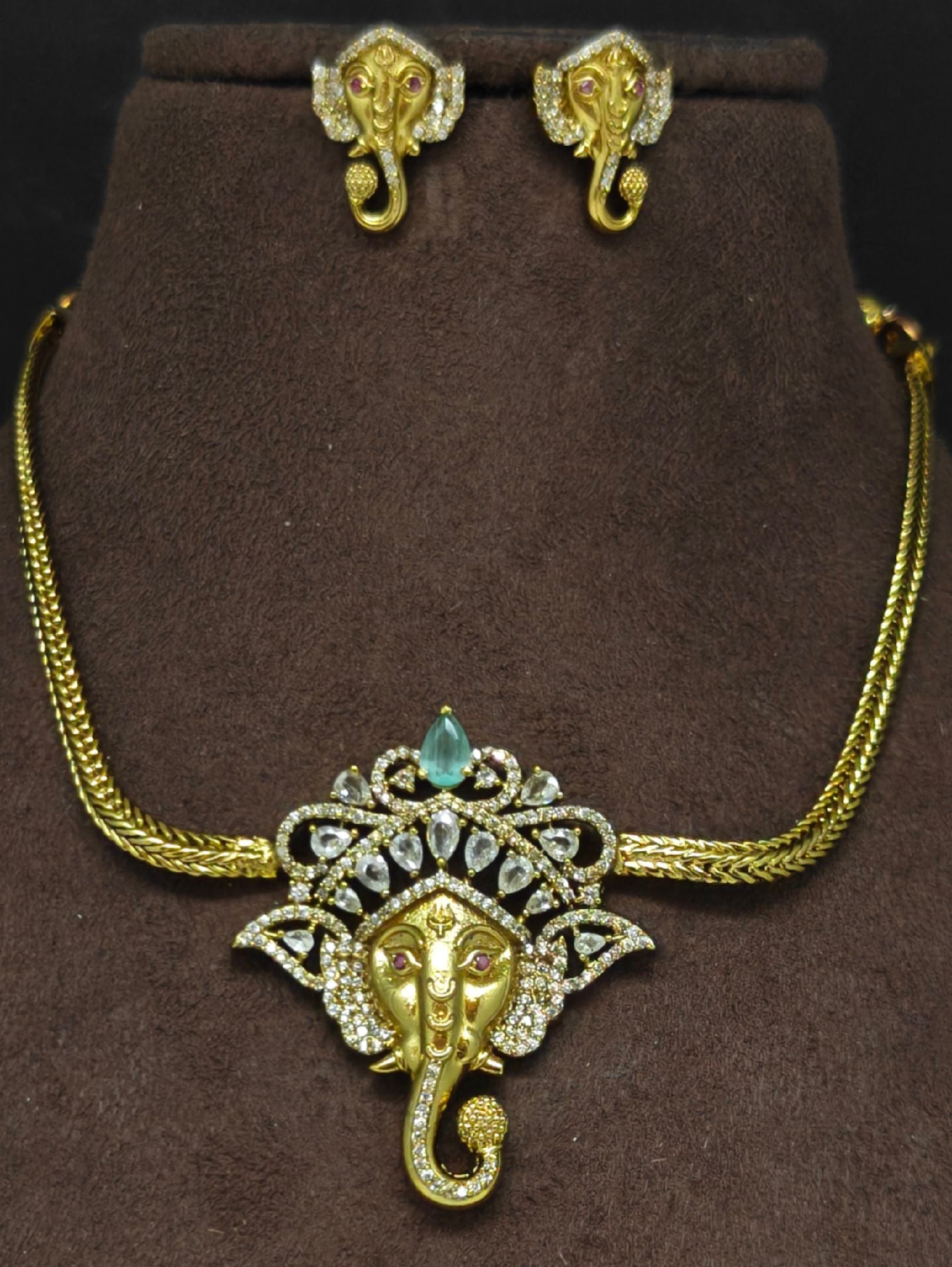 Ganesh Naan Patti chain in a Ganesh locket combines cultural symbolism with craftsmanship. This unique accessory features a delicate naan patti design encased within a beautifully crafted Ganesh-shaped locket, symbolizing prosperity and tradition. It serves both as a meaningful keepsake and a representation of Indian heritage, blending artistry with spiritual significance in a wearable form.