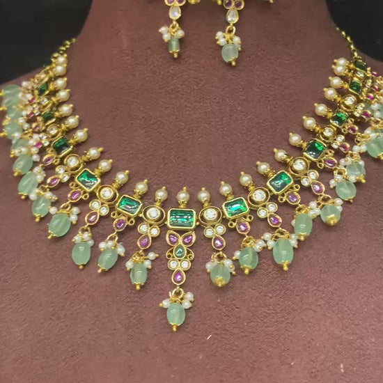 Elevate your ethnic ensemble with this stunning Jadau Style Kemp Necklace, a masterpiece that blends traditional craftsmanship with timeless elegance. Featuring intricate jadau work—the ancient art of setting gemstones in gold foil—this necklace showcases vibrant kemp stones that catch light beautifully. Perfect for weddings, festivals, or special occasions, it adds a regal touch to any traditional outfit. The detailed design reflects authentic Indian jewelry heritage, making it an investment piece that celebrates cultural artistry. Wear it with confidence and grace.