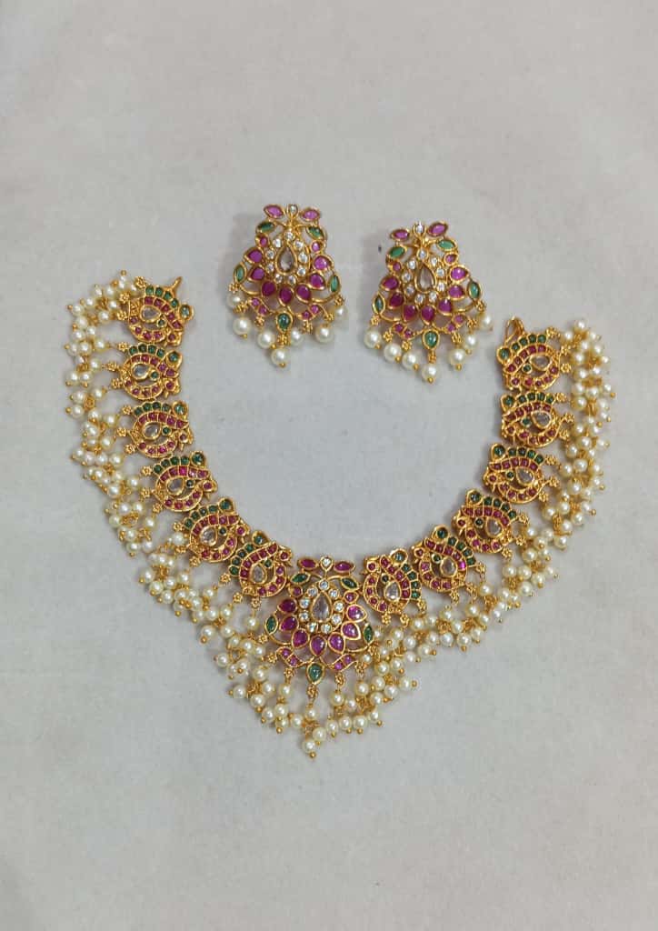 Celebrate timeless elegance with this exquisite Jadau style mango short haram. Crafted with meticulous artistry, this traditional piece features the iconic mango motif rendered in authentic Jadau technique—where precious stones are individually set into gold without adhesive, ensuring lasting brilliance. Perfect for weddings, festivals, and special occasions, this short haram adds regal sophistication to any ensemble. The intricate detailing and vibrant gemstone work make it a treasured heirloom piece that transcends trends. Elevate your jewelry collection with this stunning symbol of Indian craftsmanship and timeless beauty.