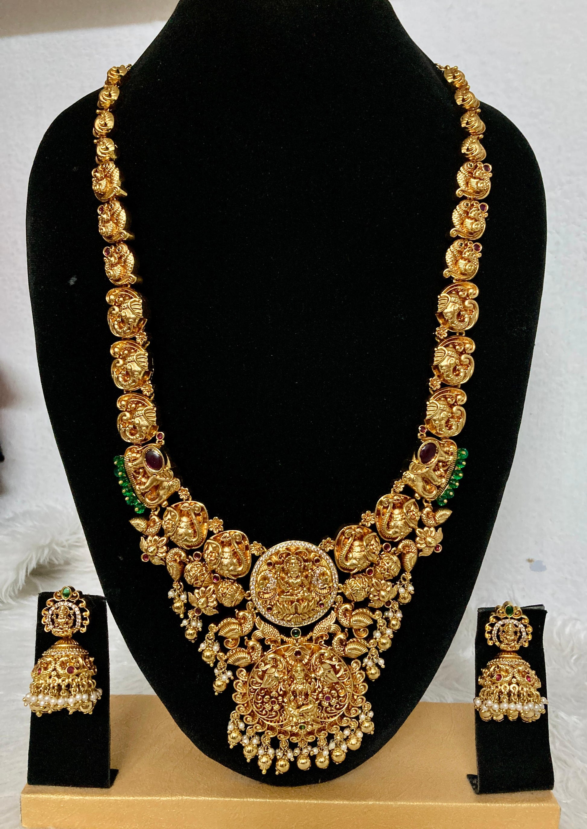 Elevate your bridal ensemble with the exquisite Laxmi Bridal Nakshi Haram, a masterpiece of traditional craftsmanship. This stunning necklace features intricate nakshi work—hand-carved detailing that showcases timeless artistry and sophistication. Perfect for weddings and special occasions, the Laxmi design symbolizes prosperity and grace, making it an auspicious choice for your most memorable moments. Crafted with meticulous attention to detail, this haram complements traditional bridal attire beautifully while adding an authentic touch of heritage elegance to your look.