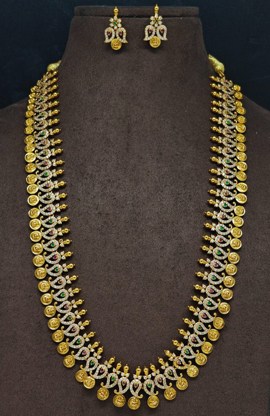 # Bridal Mango Kasu Haram Make a stunning statement on your wedding day with this magnificent Bridal Mango Kasu Haram, designed to complement your bridal ensemble with unparalleled grace. This ornate piece features the revered mango design, symbolizing fertility and auspiciousness—essential elements of Indian bridal tradition. The radiant finish and intricate craftsmanship create an heirloom-quality accessory that captures attention and admiration. Perfect for creating that complete bridal look, this haram adds regal sophistication and cultural authenticity to your special moment. Invest in a piece that honors tradition while ensuring you shine brilliantly throughout your celebrations.