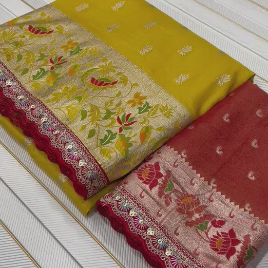 FABRIC AND OTHER DETAILS :- PURE PAITHANI TISSUE SILK JARI ALL OVER VISCOSE ZARI BODY MEENAKARI PAITHANI BORDER WITH RICH PALLU JAQURAD WEAVING SAREE WITH BLOUSE PIECE