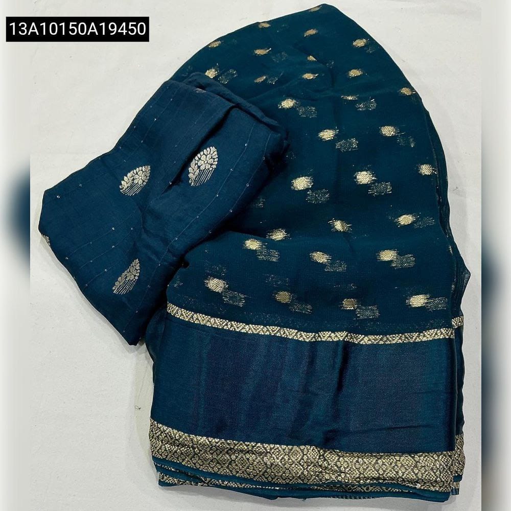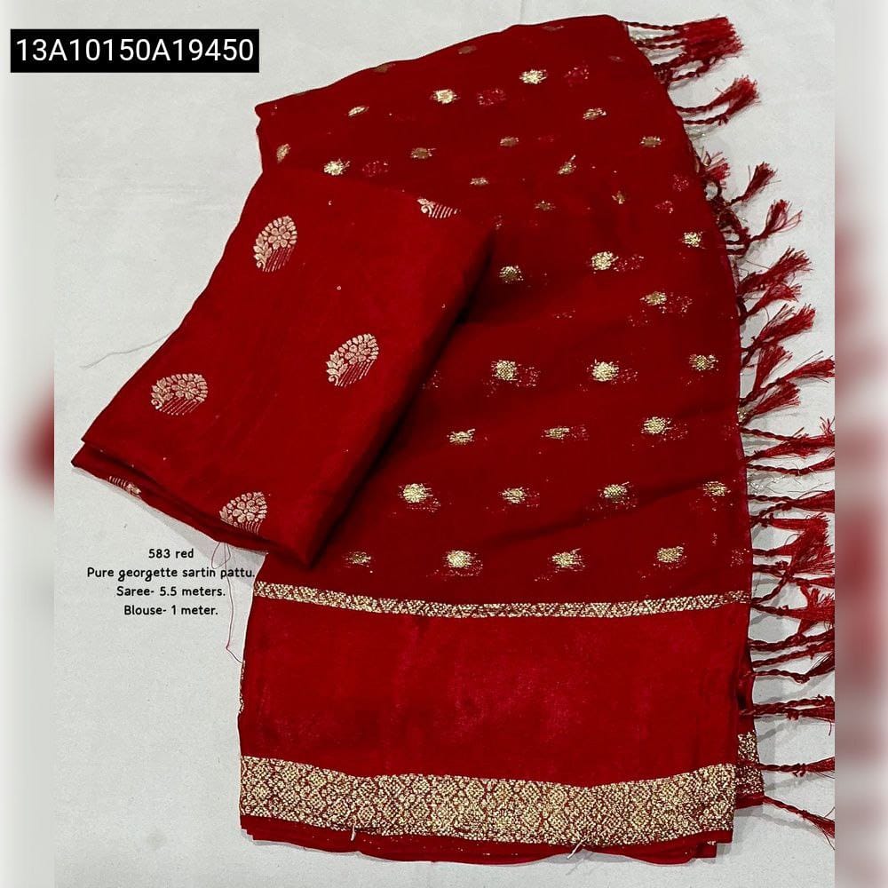 Drape yourself in timeless elegance with this exquisite pure georgette saree, adorned with intricate zari butti work throughout. The luxurious satin pattu borders on both sides add a sophisticated sheen, while delicate tassels grace the pallu for an authentic finishing touch. Paired with a perfectly matched pure dolla silk tie-and-dye blouse, this saree effortlessly combines traditional craftsmanship with refined style. Ideal for weddings, festivals, and special occasions, it's a wardrobe essential that celebrates your grace and cultural heritage.