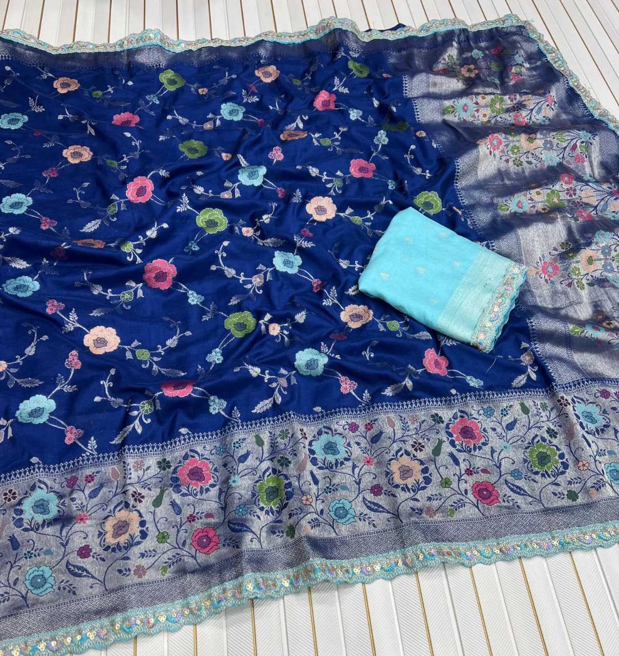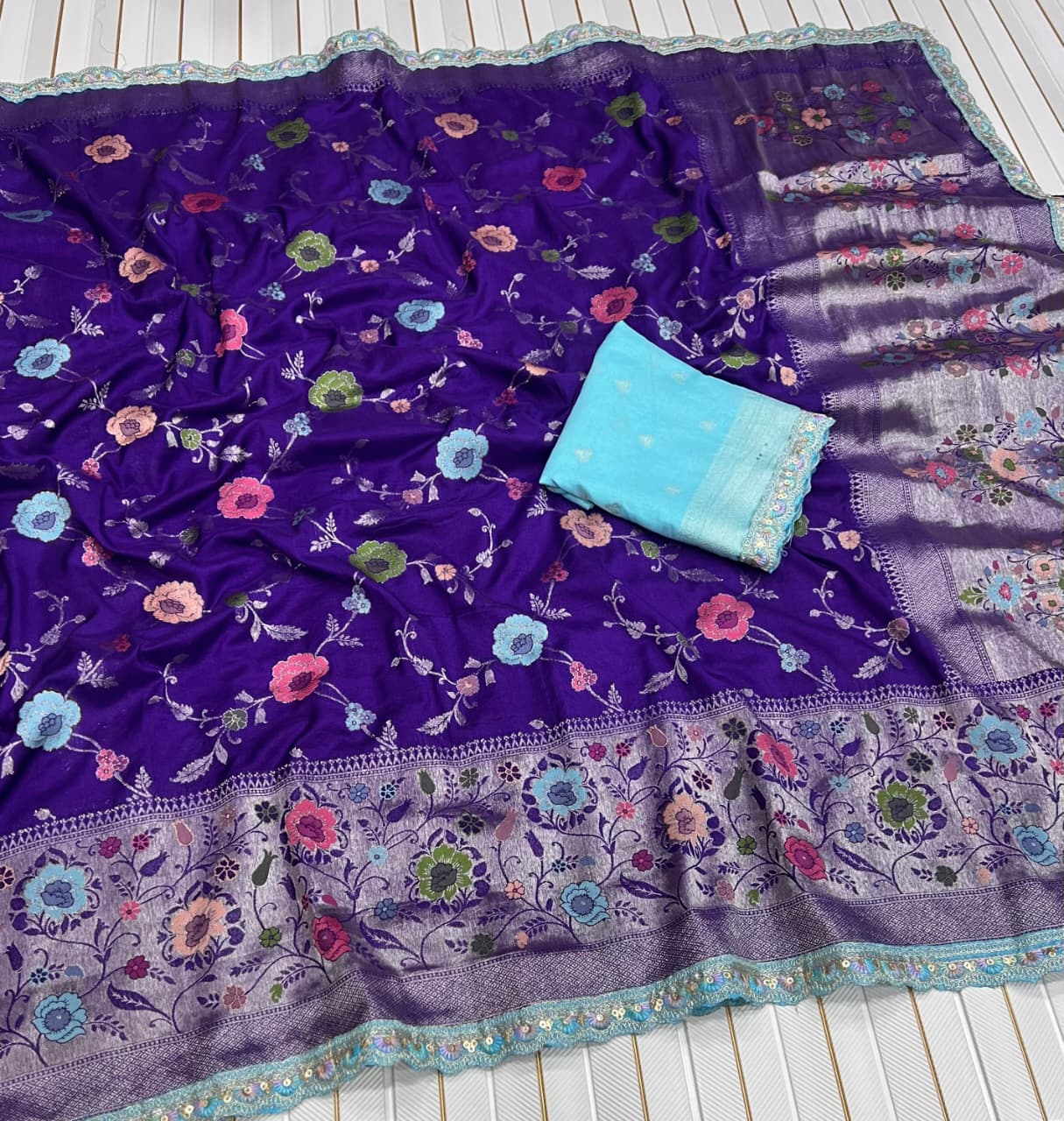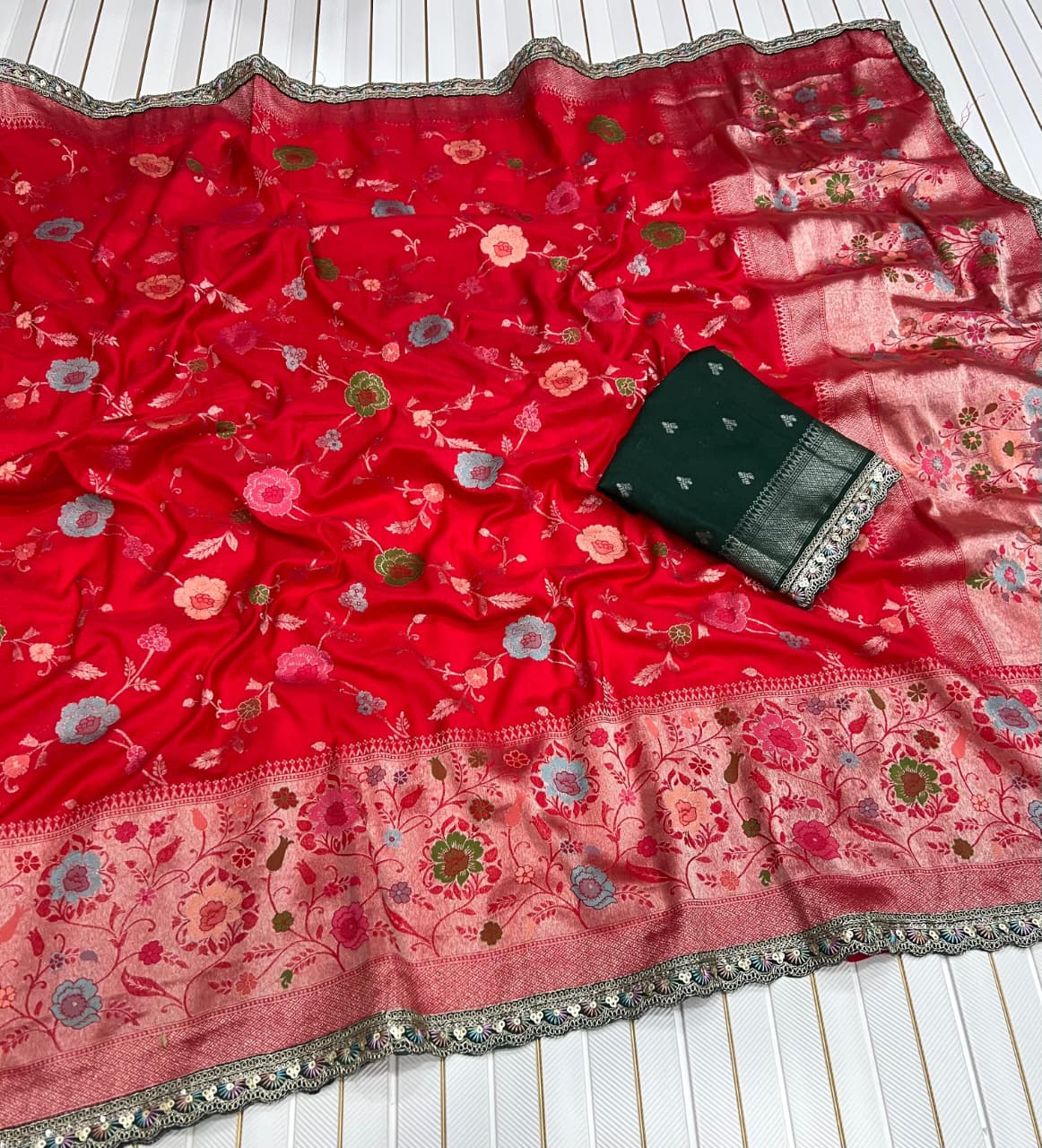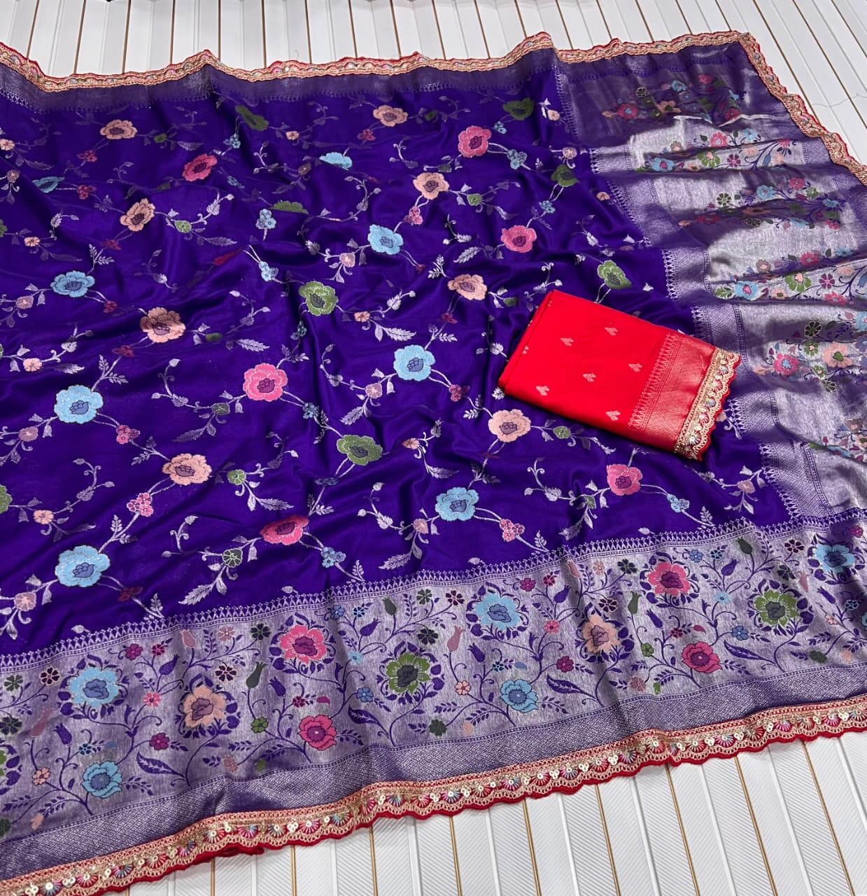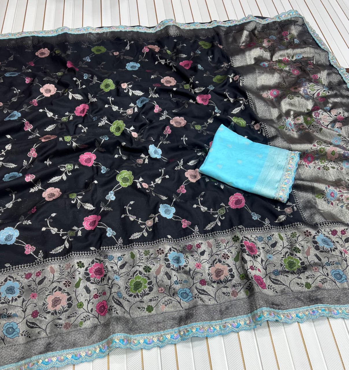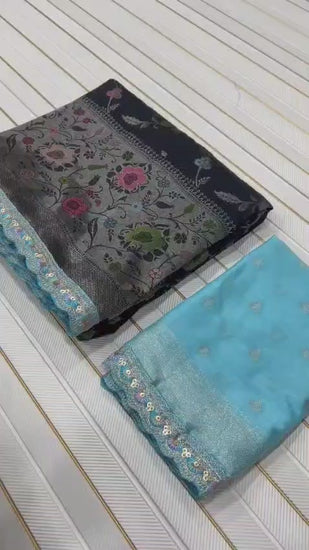 Pure Khaddi Crep Georgette Meenakari jaqurad Weveing All Over Body Flower Zaal With Paithani Border And Elegance Rich Pallu Running Blouse Piece