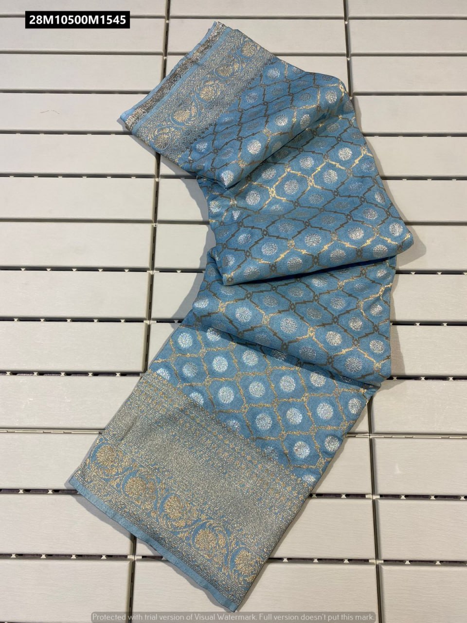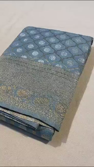 Experience timeless elegance with this Pure Khadi Georgette Silk Saree, a masterpiece of traditional craftsmanship. Adorned with intricate zari woven patterns throughout, this saree features a richly embellished pallu with royal tassels and an ornate zari border enhanced with delicate silver butti weaves. The sophisticated jaal weaving adds depth and texture to every drape, while the included running blouse completes your ensemble. Perfect for weddings, festivals, and special occasions, this saree combines authentic khadi heritage with luxurious silk comfort, ensuring you stand out with grace and sophistication.