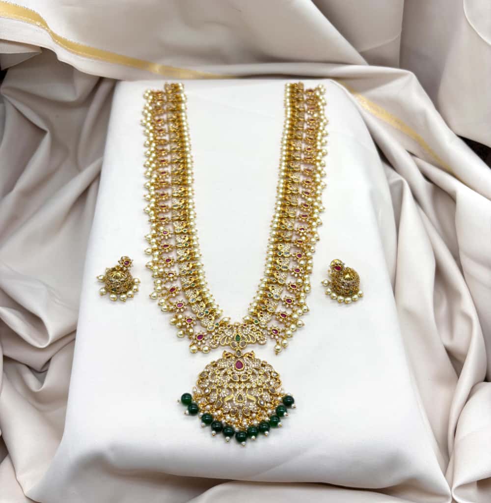 Elevate your traditional elegance with the Rukmini Haram, a stunning floral pendant adorned with lustrous pearls and rich gemstone accents. This exquisite piece captures the essence of timeless Indian craftsmanship, featuring intricate detailing that celebrates both heritage and sophistication. Perfect for festive occasions, weddings, or adding a touch of opulence to your everyday wear, this haram brings an air of grace and refinement to any ensemble. The harmonious blend of delicate florals and precious pearls creates a captivating focal point that draws admiration. Invest in a piece that transcends trends and becomes a cherished heirloom for generations to come.