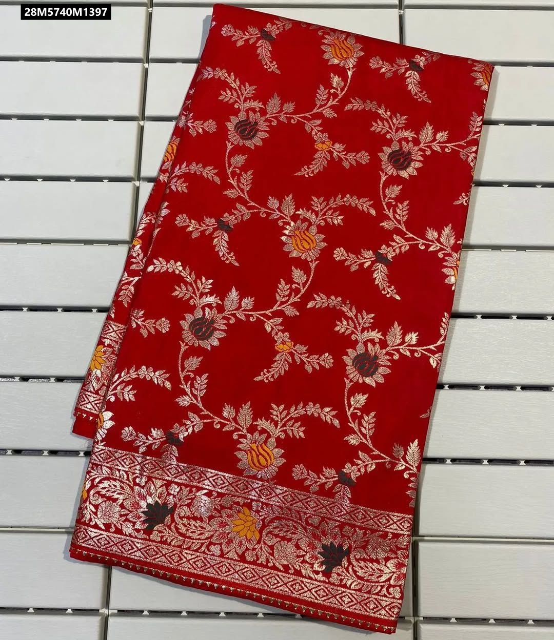 Experience elegance with this Pure Soft Russian Silk Saree, featuring exquisite Zari and Meenakari weaving throughout the pallu and the entire saree. The intricate Jacquard weaving pairs beautifully with a Vijaya piping border, enhancing its rich appeal. Complemented by a stylish blouse with jacket and sleeves adorned in matching weave, this saree promises a graceful and luxurious look perfect for any special occasion.