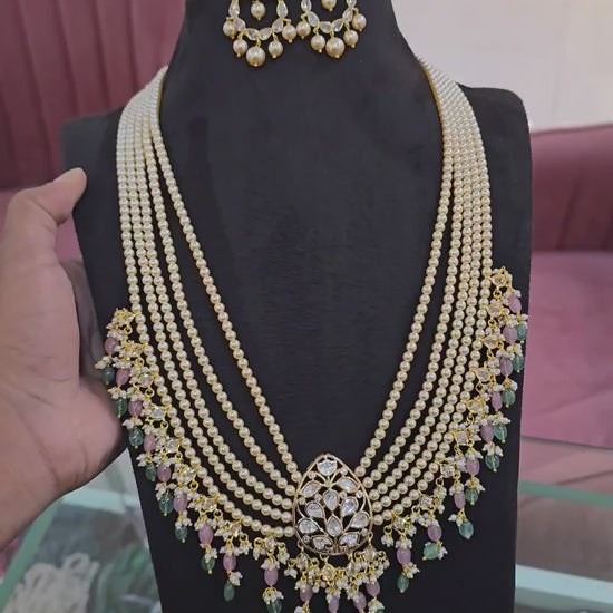 Elevate your traditional elegance with the Vasundhara Haram, a masterpiece of refined craftsmanship. This exquisite necklace features a stunning moissanite stone pendant that captures light with brilliant sparkle, complemented by lush strawberry emeralds and authentic Swarovski pearls for timeless sophistication. The matching chandbali ear tops complete the set with coordinated glamour. Crafted with premium quality materials, this haram seamlessly blends classic Indian jewelry aesthetics with contemporary luxury, making it the perfect choice for weddings, celebrations, or elevating your everyday elegance.